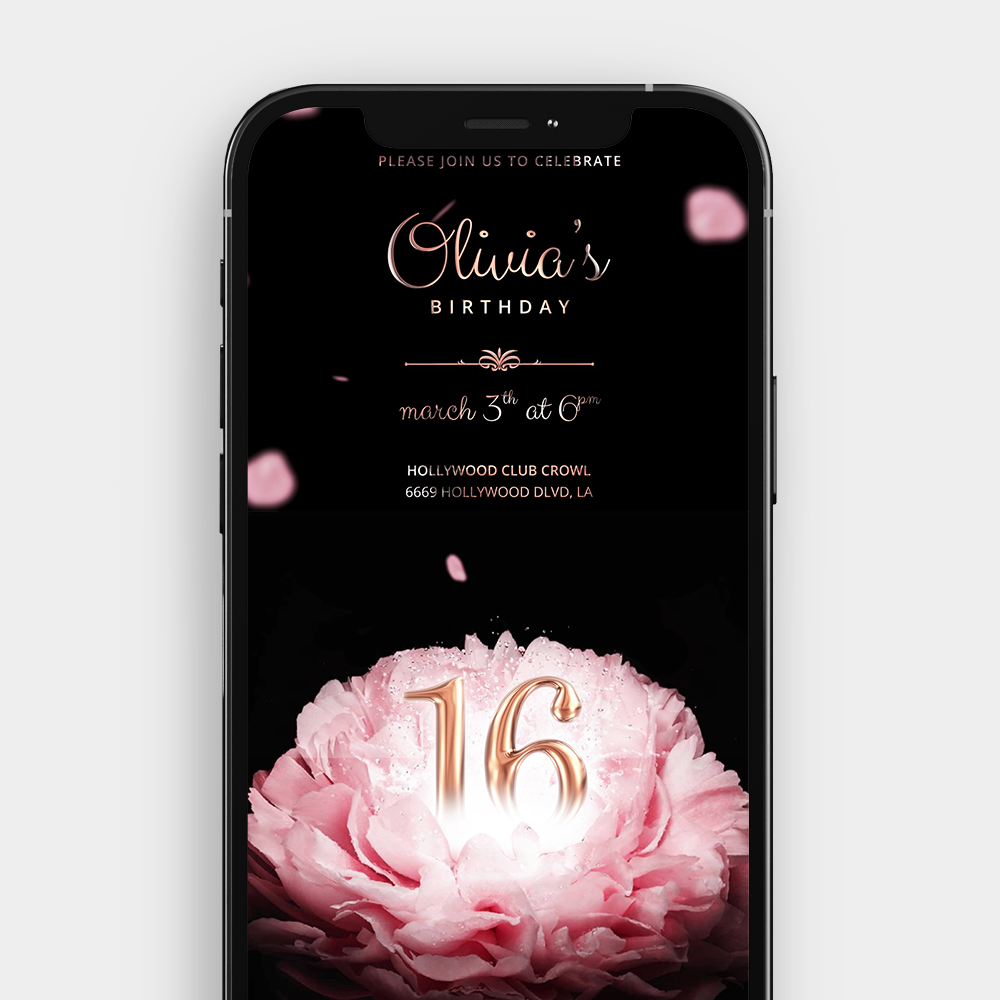 Delight your guests with this enchanting video invitation featuring blooming peonies and graceful petals floating across the screen. This design, with its delicate rose-gold and black accents, adds a touch of timeless charm, perfect for birthdays, bridal showers, or any celebration that calls for elegance.