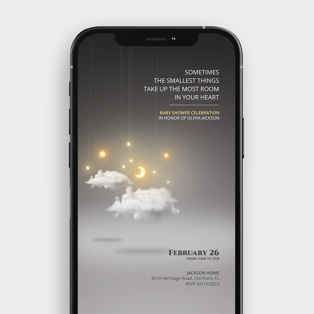 Celebrate the arrival of your little one with A Sky Full of Dreams, an enchanting video invitation crafted for baby showers. Against a soft gray backdrop, fluffy clouds float gently beside a glowing moon and twinkling stars, creating a dreamy, magical ambiance that beautifully captures the joy of welcoming a new life. This invitation is designed to bring warmth and charm to your special celebration, setting the stage for a memorable event.