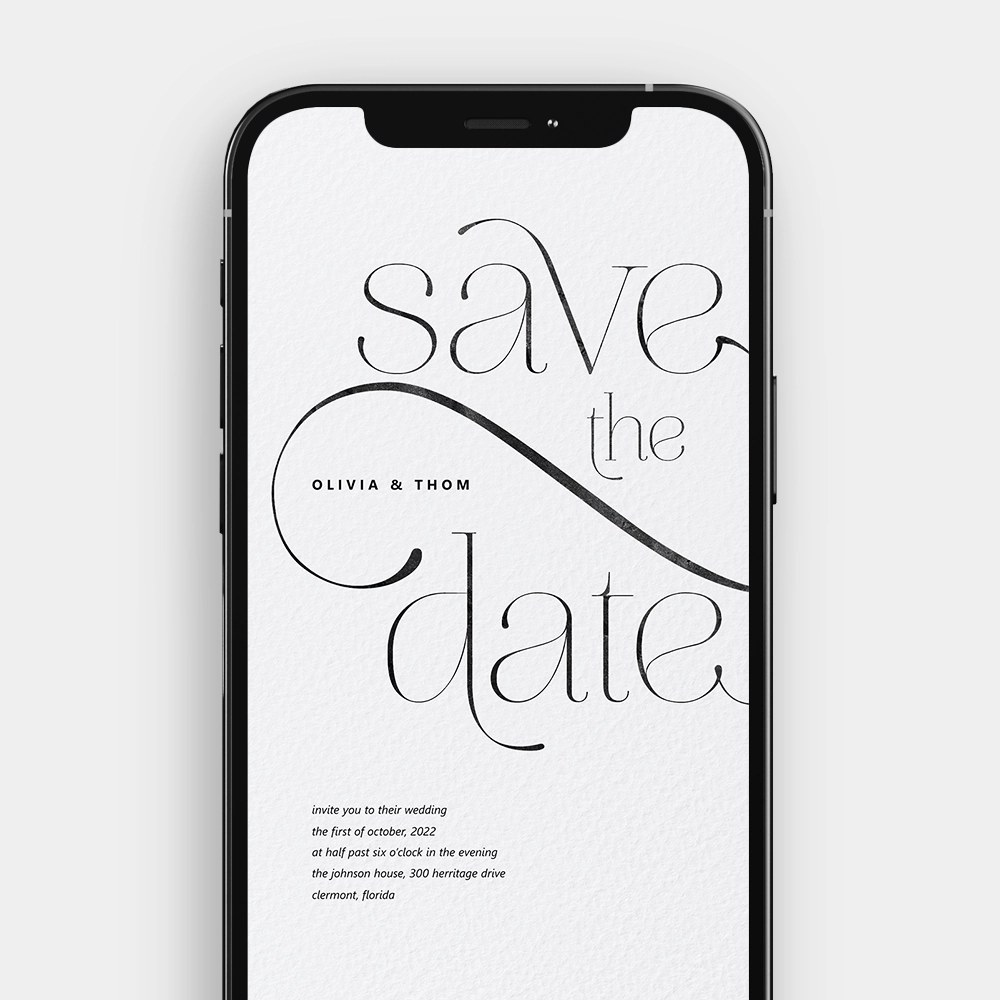 Announce your special day with an invitation that flows with grace and sophisticated simplicity. Designed for the discerning couple, our custom video captures the essence of refined luxury, ensuring your guests mark their calendars in style.