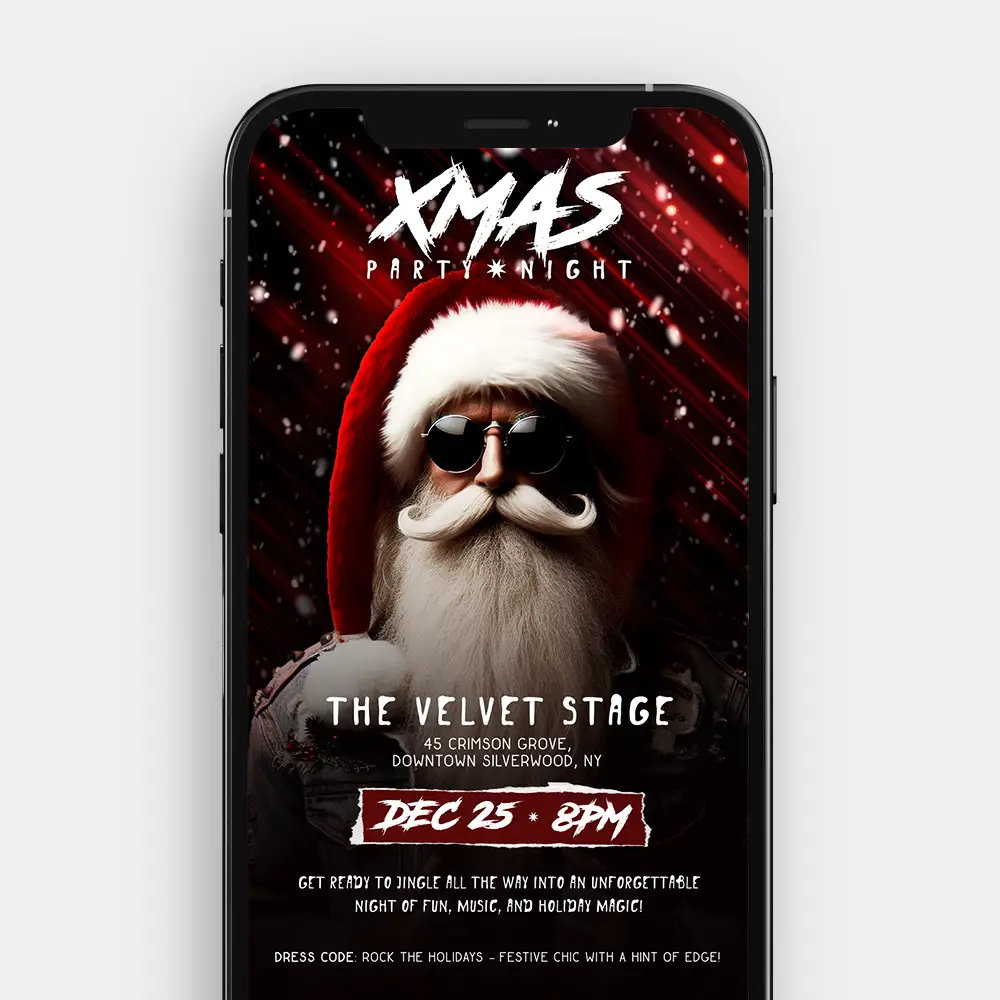 Rock your Christmas party with the Rockstar Santa video invitation, featuring epic snowfall and bold vibes for an unforgettable holiday celebration.