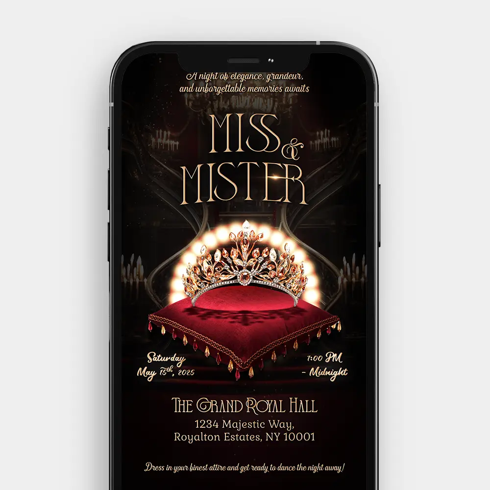 A Royal Invitation Fit for Prom Night Majesty. Step into a scene of opulence with this exquisite video invitation, where candlelight dances on gilded details and a tiara glows atop velvet. Every frame whispers luxury, setting the tone for a prom night as unforgettable as a royal ball.
